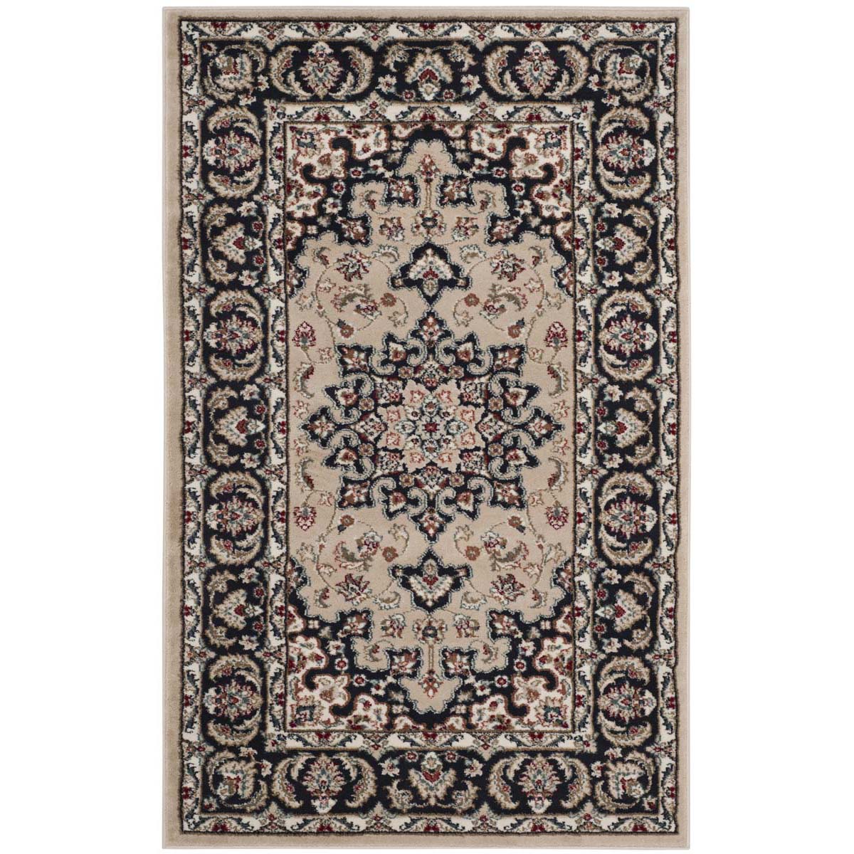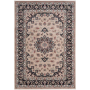 Drawing inspiration from classic design, the rug boasts a sophisticated pattern that showcases a delicate central floral medallion, bordered by intricate ornamental motifs. The rich anthracite outlines enhance the depth and dimension of the cream background, while pops of reds and soft greens add a subtle touch of color to the design, ensuring this piece will complement a wide range of decor styles.
