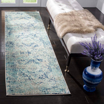 Crafted with meticulous attention to detail in Turkey, our rug features a durable polypropylene fabric that ensures long-lasting beauty and resilience against the demands of everyday life. The serene ivory and blue tones blend seamlessly, creating an opulent canvas that captivates with its intricate transitional pattern.