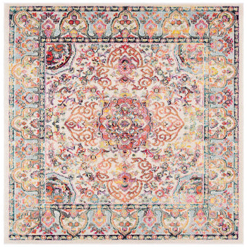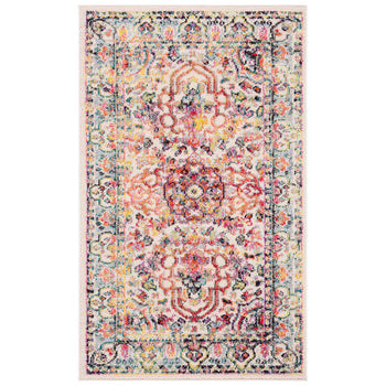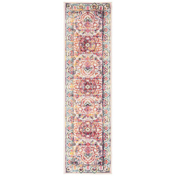 The intricate pattern of this runner rug draws inspiration from traditional designs, with a vibrant red core encased in an ivory border, infused with an array of complementary colors that add depth and intrigue to the piece. Each detail of the lively motif has been meticulously woven to captivate and enchant onlookers.