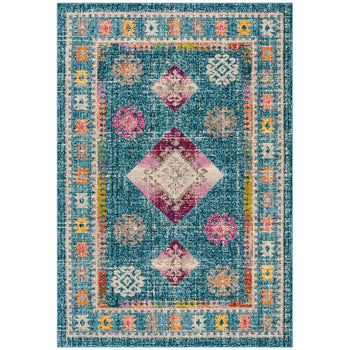 Each striking diamond motif, framed by detailed borders, reveals a symphony of colors that lend vibrancy and warmth to the design. The intricate patterns and delicate floral accents are a testament to the rug's artistic expression and skilled craftsmanship.