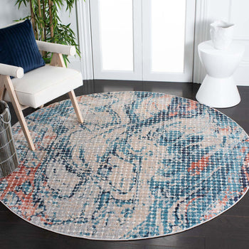 The rug showcases a stunning blend of grey and blue hues, artfully interlaced to create an enchanting transitional style that seamlessly transitions from classic to contemporary decor. The intricate pattern depicted in the image reveals a harmonious mix of abstract and floral motifs, offering a perfect statement piece that captures the eye without overwhelming your room's design.