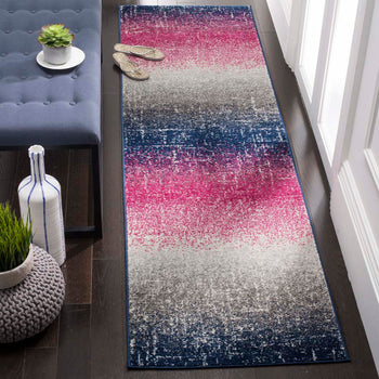 Introducing our strikingly contemporary runner rug, a blend of bold fuchsia tones set against a sophisticated navy backdrop, creating a visual masterpiece for your home. Size 2'-3" X 8' and boasting a practical 3/8" pile height, this runner is an ideal choice for high-traffic areas, offering both comfort and durability.