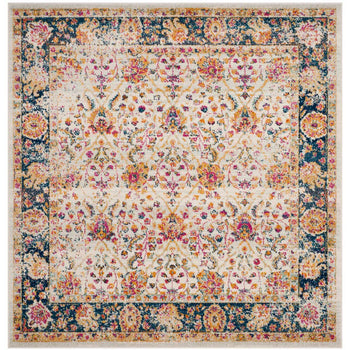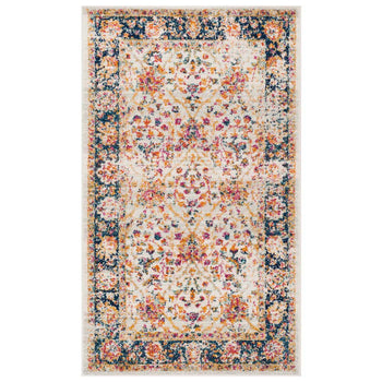 The delightful cream base is accented by a navy border and punctuated with splashes of vibrant colors, echoing a story of rich heritage in every fiber. The intricate detailing and color palette seen in the image underscore the rug's ability to complement a wide range of interior decors, from the classic to the contemporary.