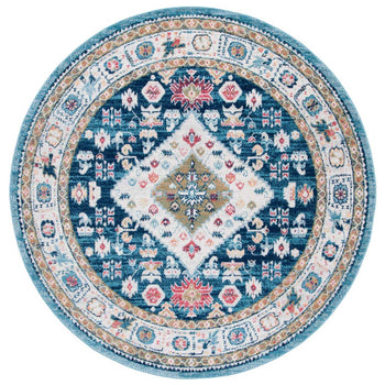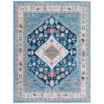 The rug?s captivating pattern, as visible in the image, showcases a harmonious palette of light blue and ivory, embellished with delicate motifs and hints of reds and yellows, offering an air of sophistication and warmth to your decor. Each detail of the ornate design speaks to a legacy of artisanal craftsmanship, while the modern materials bring contemporary ease.