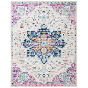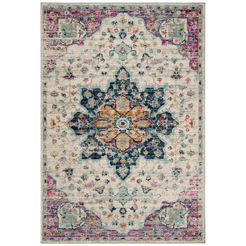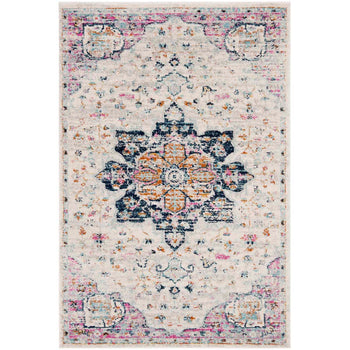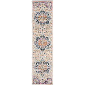Introducing our exquisite 2' x 8' Runner Area Rug, a stunning addition to any corridor or slender space desiring a touch of elegance and comfort. Boasting a soft ivory base bedecked with vibrant fuchsia highlights, this rug radiates with a kaleidoscope of colors that complement its transitional style, seamlessly blending modern design with traditional charm.