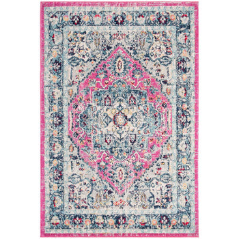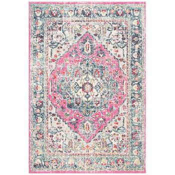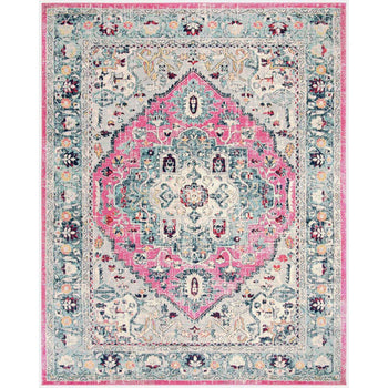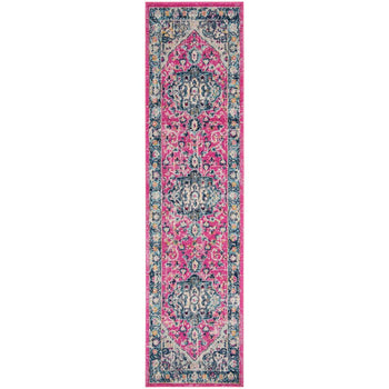 With a compelling transitional style, the rug features an eye-catching pattern that dances across its length in bold fuchsia and serene aqua tones. This arresting design will surely become the focal point of any hallway or narrow space, inviting a pop of color that's both unexpected and enchanting.