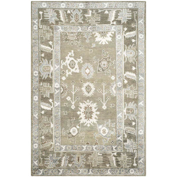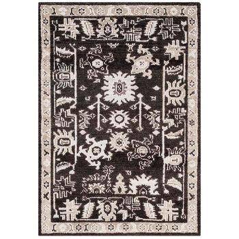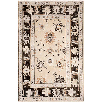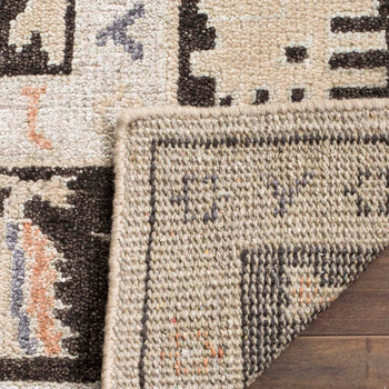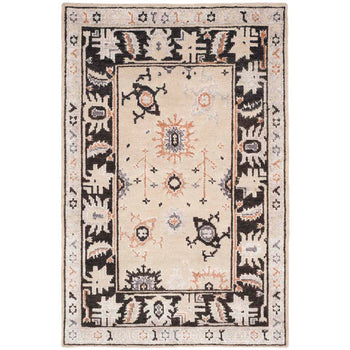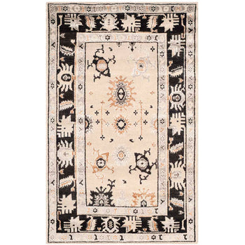 Introducing our exquisite 4' X 6' hand-knotted area rug, a perfect blend of traditional craftsmanship and modern aesthetics. The warm beige backdrop beautifully contrasts with bold charcoal accents, making this piece a versatile addition to any room. Crafted in India, the rug boasts a pattern that features a medley of ornamental motifs, including geometric shapes and stylized florals, which evoke a sense of heritage and sophistication.