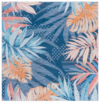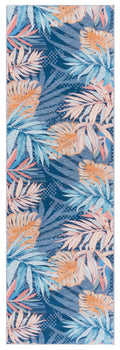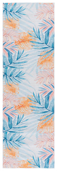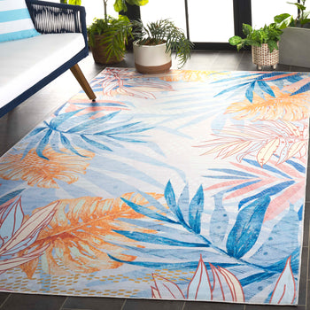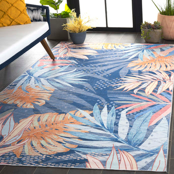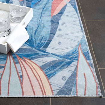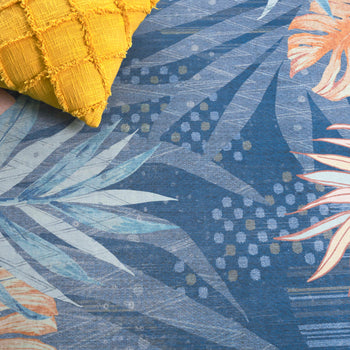 It is adorned with a luscious palette of blue and light blue hues, providing a serene yet vibrant backdrop for the tropical leaf patterns that dance across its surface. This durable rug, constructed from high-quality polyester, offers a washable convenience, ensuring long-lasting freshness and ease of maintenance.