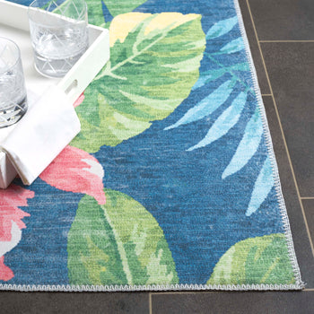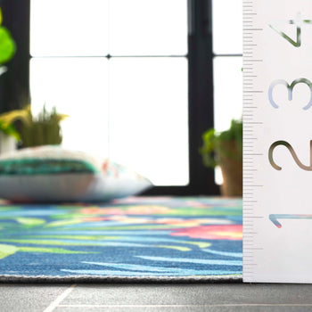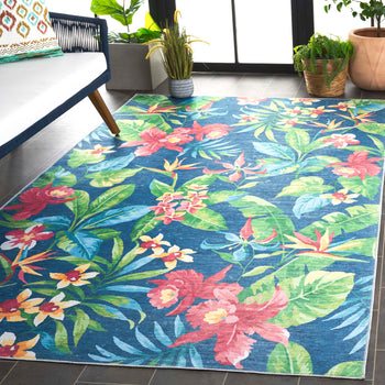 Crafted with meticulous attention to detail, this rug showcases a vibrant pattern of lush florals and foliage in a harmonious blend of dark blue and green tones, creating a serene and inviting atmosphere. The low profile with a 1/8 inch height ensures a seamless fit under doors and in tight spaces, reducing the risk of tripping.