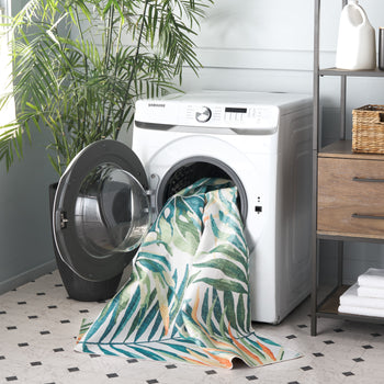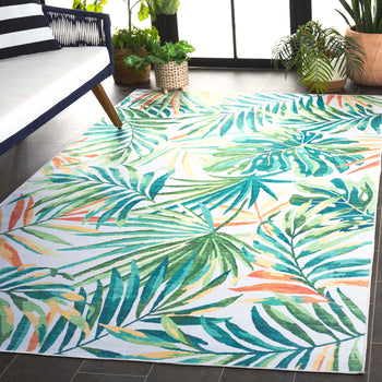 The contemporary design of this rug features an exquisite pattern of tropical foliage, presenting an array of green tones with subtle accents of orange, creating a fresh and inviting look. The low-profile height of 1/8 inch ensures a sleek, unobtrusive presence, allowing for seamless integration with your current decor.
