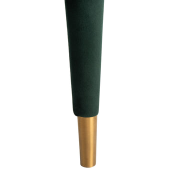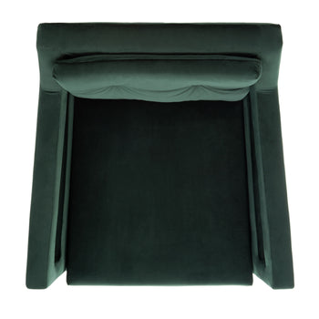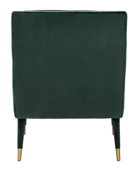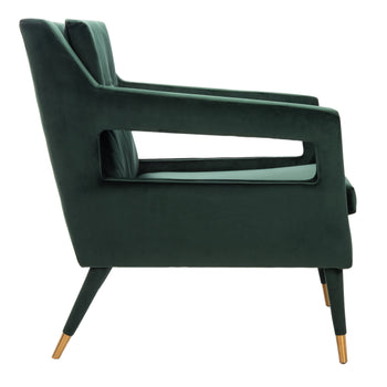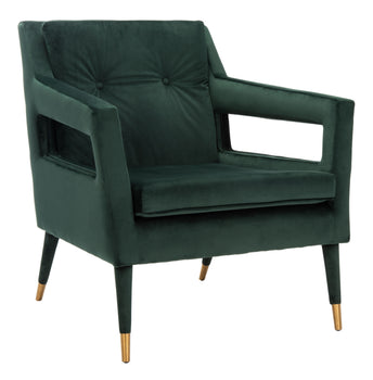 Designed for elegant and comfortable living, this Mara Accent Chair is a new classic. Mara's uniquely angled silhouette and cut-out arms are softened by luxurious forest green velvet upholstery with button-tufted detail, and the gold-finished caps on its legs add radiant retro flair.