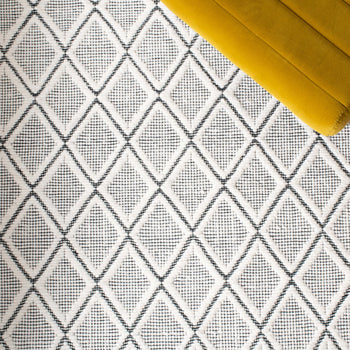 The rug boasts a modern geometric diamond pattern that lends a contemporary chic vibe. Its low profile with a pile height of 1/4" makes it ideal for placement under furniture or in high-traffic areas, blending style with practicality.