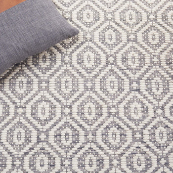 Designed for the discerning eye, the rug features a sophisticated geometric pattern that exudes a timeless charm, effortlessly complementing your existing decor. The grey and ivory color palette is versatile and on-trend, making it an ideal choice for any room in your home.