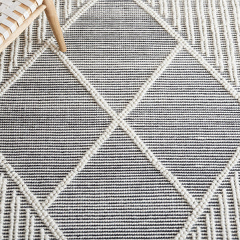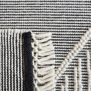 The rug's design features a striking geometric pattern, capturing the eye with its bold Ivory and Black shades. This dynamic visual effect is enriched by the textures and details visible in the image, showcasing a mix of intricate diamonds and linear elements that speak to both contemporary and timeless aesthetics.