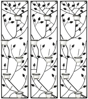 This modernized vine and leaf wall sconce, carefully wrought from iron, features five glass candle holders on each of its three panels. Shown in a dramatic black finish, this candle holder will prove a dramatic addition to any wall.