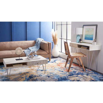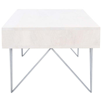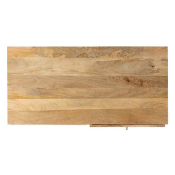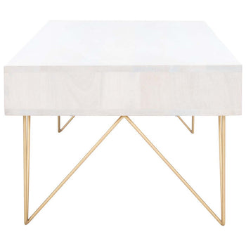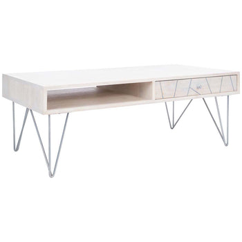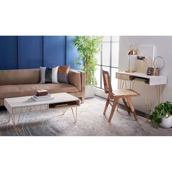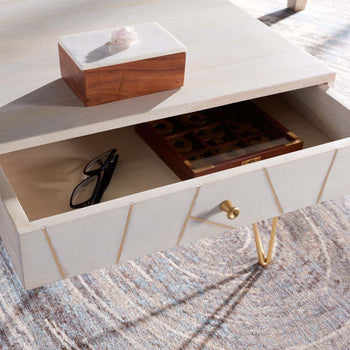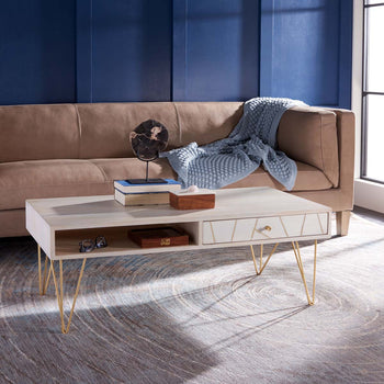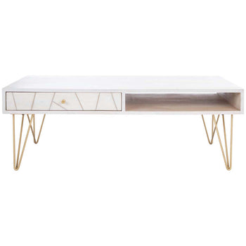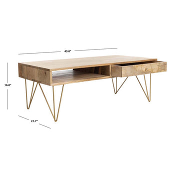 This Marigold Coffee Table brings decorative drama to any room with its retro inspired design and chic artisan details. Geometric hairpin legs in a sleek brass finish beautifully pair with the matching inlay on Marigold's slim drawer, perfectly offsetting its smooth natural mango wood and open middle shelf.