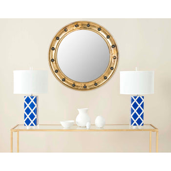 A looking glass fit for an English maNr, the Mariner Porthole mirror exudes Old World elegance and classic good taste. Its hand forged iron frame is beautifully finished in antique gold, and punctuated with flat black faux nailheads for nautical flair.