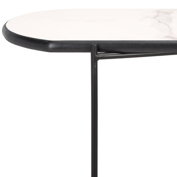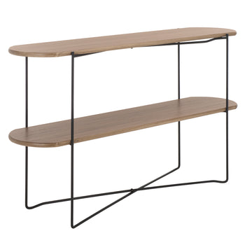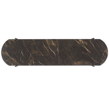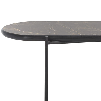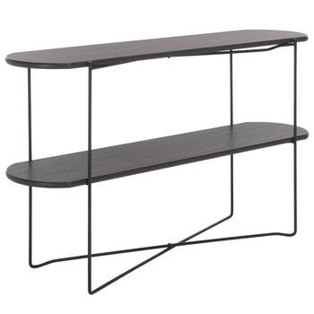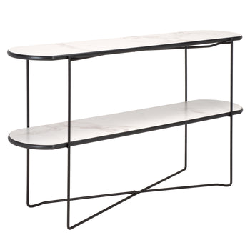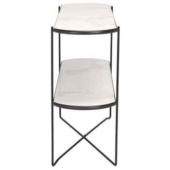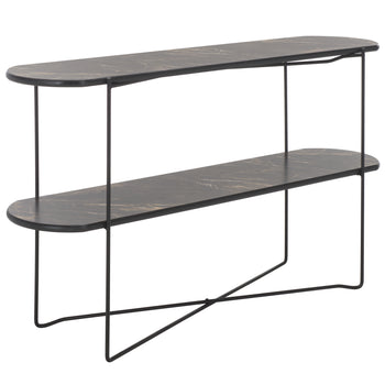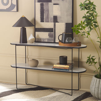 Make a sleek and sophisticated statement with our Marlee console table. The refined geometry of the console meets a blend of fine materials to make a stylish impact. The sleek, curved edges lend a chic and inviting appeal to our console table. It is perched upon slender black metal legs that intersect to make any space will feel open and sleek. Featuring a shelf to provide ample display space, our console table remains perfect for styling and personalizing your entryway, living space, or home office.