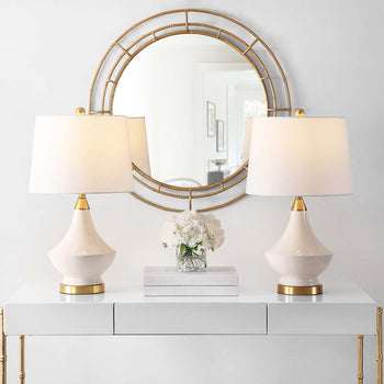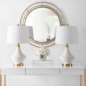 A modern glam interpretation of exotic Arabian pottery, this Marlowe Table Lamp gives any room an eye catching shine. Marlowe's boldly sculpted white ceramic is dramatically elevated with glamorous gold finished accents, making a fabulous statement in contemporary interiors. Sold in sets of two.