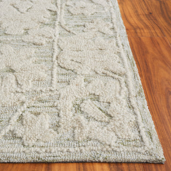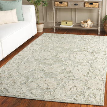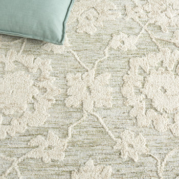 Drawing inspiration from classic motifs, the rug features an ornate pattern that combines floral and vine elements, with subtle variations in tone to create a sense of depth and texture. Constructed with a blend of 70% wool for warmth, 20% cotton for softness, and 10% PET yarn for durability, this piece offers an exceptional balance of comfort and resilience.