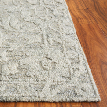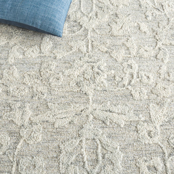 The rug's enchanting traditional style is characterized by its intricate floral pattern, a delightful dance of botanical motifs spread across its length in a subtle yet captivating grey and ivory color palette. The contrasting hues are woven with exceptional care to create a piece that not only serves as a functional decor element but also as a work of art that complements any interior.