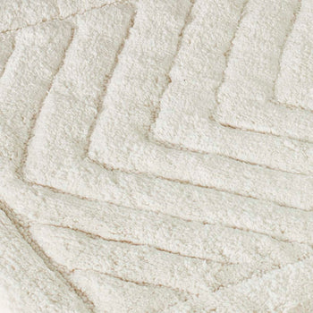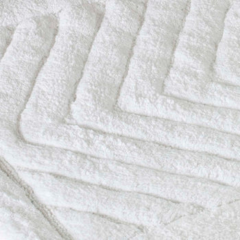 The gentle white-on-white color palette serves as a sophisticated backdrop for the dynamic geometric pattern that adorns the rug. The design features an array of crisp, clean lines forming concentric diamonds, creating a sense of depth and texture that will enhance any interior. Each line is meticulously tufted, showcasing the rug's exceptional craftsmanship and attention to detail.