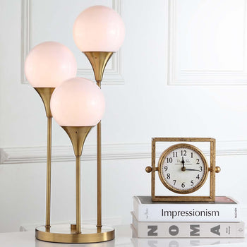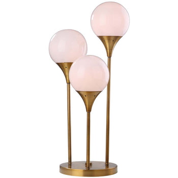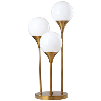 Bring high style to any interior with this sleek Marzio Table Lamp. Designed with three vintage inspired lights in ascending heights, its brass gold finish and glowing white globes add deluxe contemporary chic to the living room, entryway, or hall.