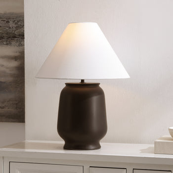 Introducing the Mattie, a stunning 20.5 inch black ceramic table lamp that effortlessly blends style with functionality. This exquisite piece, with its sleek black ceramic body, is designed to be a captivating focal point in any room. The fabric shade complements the elegant base, offering a warm and inviting glow that transforms your space into a cozy haven.
