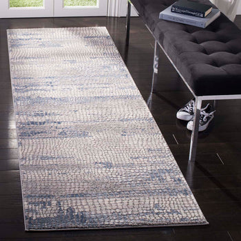 Adorned with a chic pattern that interweaves shades of soothing grey and deep navy blue, this runner creates a serene yet striking visual impact. The intricate design, revealed in the image, displays a harmonious abstract motif that brings dynamic texture and movement to your floors.