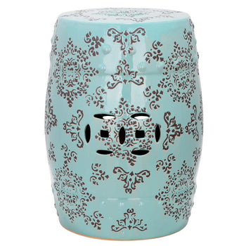 Adorned with lacy motifs adapted from Chinese silk brocade, the Medallion Garden Stool adds international flair to both indoor and outdoor spaces. With soft grey florals on its robin's egg blue ceramic, Medallion is great in pairs or by itself as a striking decorative centerpiece.