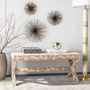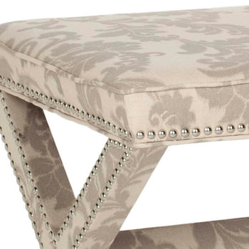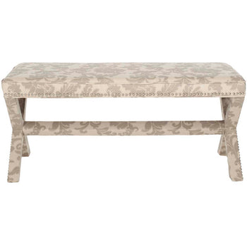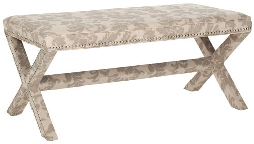 The classic X bench evolves to an elongated shape, far different from its original c.1500s beginnings as a simple stool. Updated to complement any decorating style from contemporary to traditional, the Melanie extended bench gets its custom look from a sophisticated fabric in a blend of linen and cotton in damask leaf pattern of taupe and beige. Detailed with silver nail heads, the fully upholstered Melanie is ideal at the foot of the bed, in living or family room.