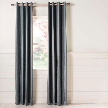 The classy coastal flair of the Biltmore Hotel inspired the cool coloring and rich textured finish of the Melissia Window Panel. Sun resilient synthetic and linen fabric, colored tonal bands of light grey, convey height and subtle drama making Melissia a popular choice for the living room or bedroom. Polished metal grommets and a soft blackout lining further enhance the practical charm of these ambient drapes.