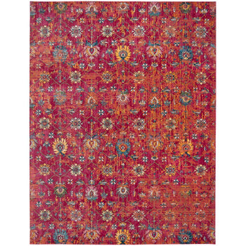 Drawing inspiration from classic motifs, the rug features a symphony of florals and geometric patterns, all set against a vibrant red base that is sure to add warmth and character to any room. The multi-colored accents provide versatile compatibility with a variety of color schemes, making it a perfect centerpiece for your living space, dining room, or foyer.