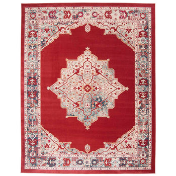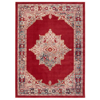 Infuse your living space with the timeless elegance of our 4' X 6' small rectangle area rug, a piece that seamlessly blends traditional charm with modern craftsmanship. Proudly made in Turkey, this rug features an opulent red field complemented by accents of soothing aqua, creating a visually striking yet harmonious color palette.