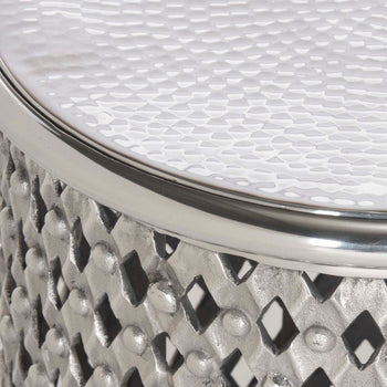 The cosmopolitan Metal Lace Table Stool takes its inspiration from the open lattices of classic Mediterranean architecture. Its gracious aluminum body and sophisticated silver finish make it ideal for adding sculptural intrigue to contemporary interiors.