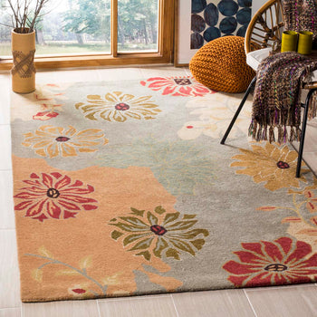 The rug boasts a vibrant, multi-colored palette that effortlessly enhances any decor. Its intricate floral pattern exudes a timeless charm, featuring blossoming flowers in shades of red, green, brown, and beige, set against a soothing grey background. The careful attention to detail in the design and hand-tufted construction creates a unique piece that combines traditional craftsmanship with modern aesthetics.