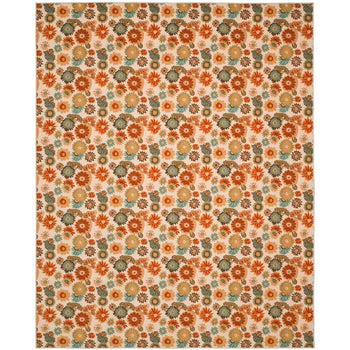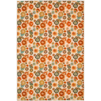 The enchanting beige backdrop of the rug is adorned with a delightful multi-colored pattern featuring symmetrical floral motifs that dance across the surface. The intricate design exudes a timeless aesthetic while introducing a burst of color and texture to your home. Each flower is meticulously detailed, showcasing a rich palette of earthy greens, vibrant oranges, and serene grays, bound to complement an array of interior design themes.