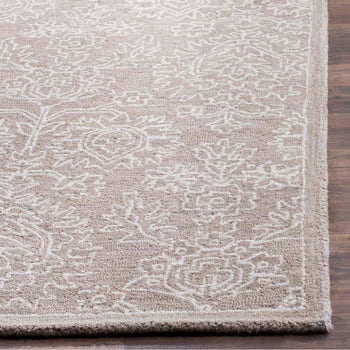 The rug's design features a classic pattern inspired by traditional motifs, with ornate floral and geometric shapes that convey a sense of heritage and sophistication. Hand tufted with precision, the rug boasts a low pile height of 1/8 inch, providing a comfortable walking surface without compromising on style.