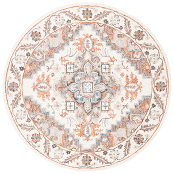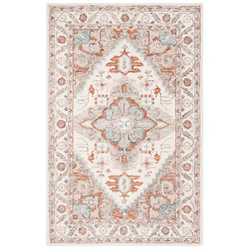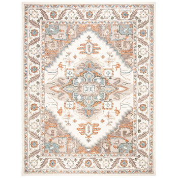 Boasting a beautiful ivory base complemented by alluring rust accents, the design draws inspiration from contemporary styles, blending seamlessly with modern and classic decors alike. The intricate pattern featured on this rug exhibits an elegant motif that exudes a sense of balance and grace, making it an eye-catching statement piece.