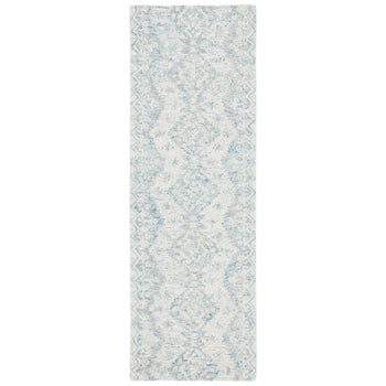 Adorned with an intricate pattern in serene ivory and blue tones, this accent rug encapsulates a delicate blend of traditional aesthetics with a touch of modern tranquility. The detailed design showcases a symmetrical arrangement of ornate motifs and florals, creating an enchanting focal point in any room.