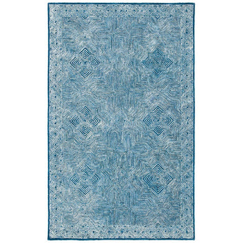 The rug features an intricate pattern that draws on modern geometrics, with a mesmerizing maze of blues that range from deep navy to soft sky, creating a dynamic visual texture that is both soothing and stimulating. The striking blue hues are sure to bring a sense of tranquility and sophistication to any space.