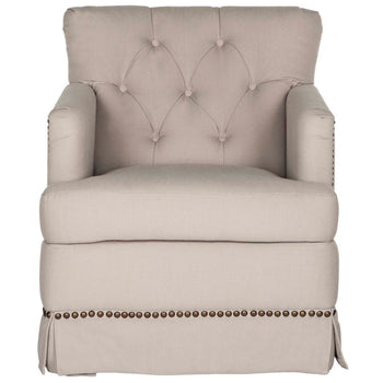 Classic lines belie the modern day comfort of this elegant swivel arm chair in crisp taupe linen accented with brass nailheads. A diamond tufted back, plush loose cushion, and skirted bottom give this cozy chair a high end decorator look.