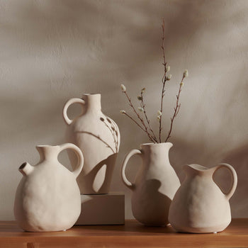 Give a charming and timeless appeal to your home with our Misa vase set. Inspired by the elegance of found artifacts, our vases beautifully update a traditional vessel. It features a voluminous body and large handles to make a stunning design statement. With subtle hand impressions and a matte beige glaze, our vase attains a soothing organic appeal to complement any decor. The vases can create a charming and eye-catching presentation of your faux botanicals and freshly cut flowers.