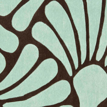 The striking rug features a stunning pattern of organic, abstract shapes in a harmonious blend of soft blue and deep brown hues, creating an artistic statement that is both bold and inviting. The hand-tufted construction reflects a commitment to quality, resulting in a durable piece that maintains its beauty over time.