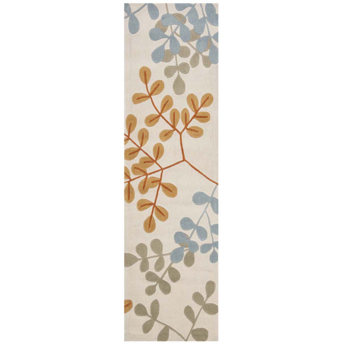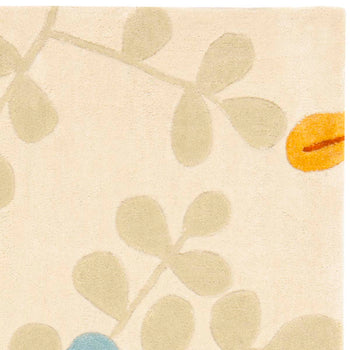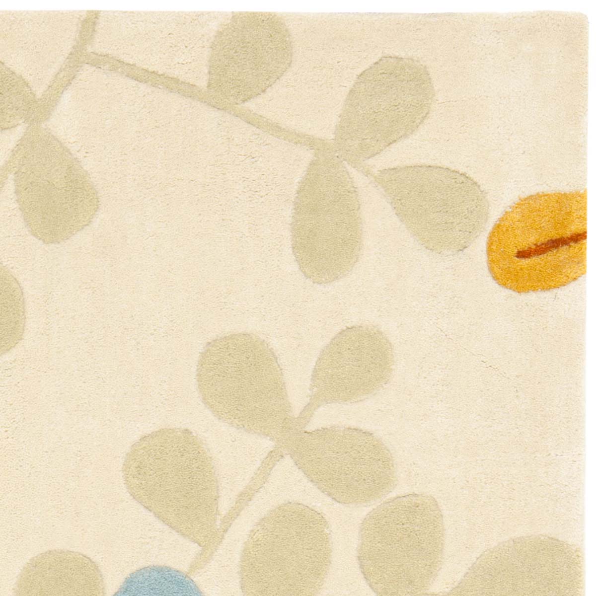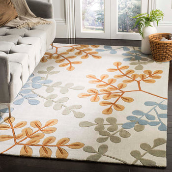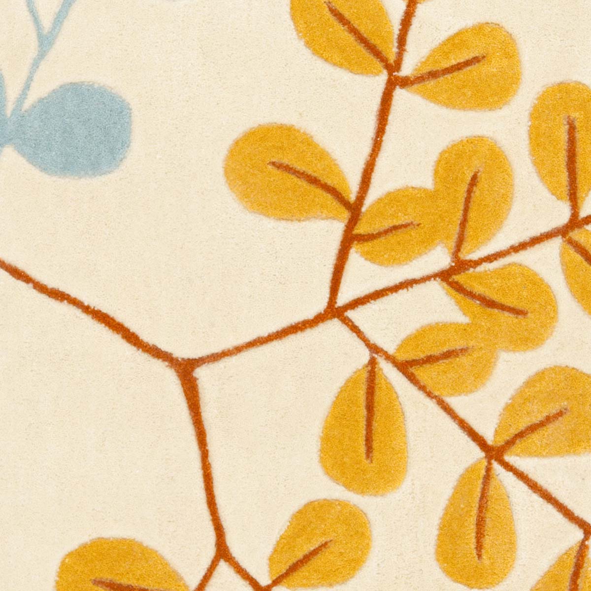 Delicately intertwined branches adorned with leaves in soothing shades of blue and warm amber tones create a captivating rug pattern, providing both comfort and elegance. This exquisite piece is a testament to refined craftsmanship, perfect for adding a touch of serenity to any room in your home.
