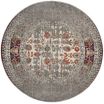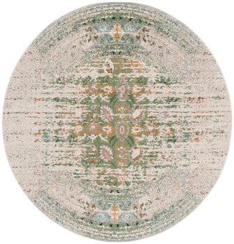 The rug captures the imagination with its round shape and an inviting pile height of 3/8", providing a plush stepping surface that caters to comfort. Adorned with a beautifully distressed pattern, this area rug offers a symphony of color that complements a wide array of interior styles, from the contemporary to the traditional.