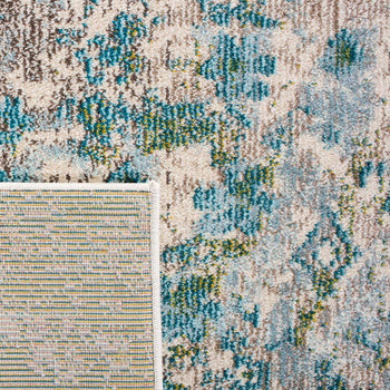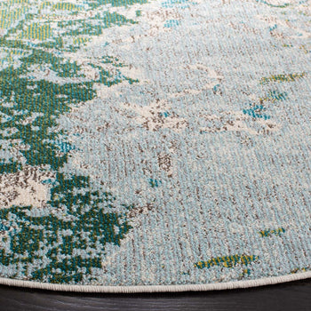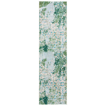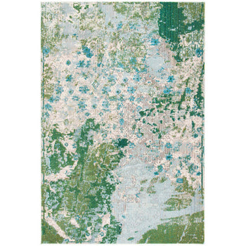 The contemporary style rug boasts a harmonious mix of green and turquoise, bringing a refreshing pop of color to any space. The intricate pattern features a dynamic blend of abstract and botanical motifs, creating a mesmerizing visual appeal that draws the eye.