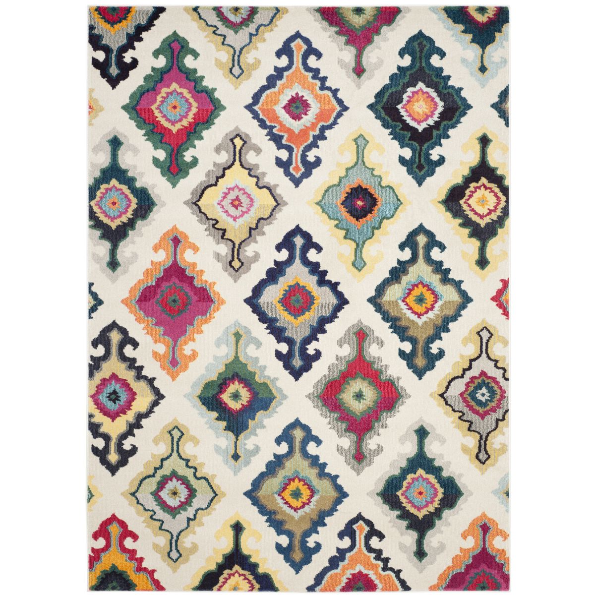 Designed in Turkey, this rug imbues your home with the essence of rich cultural craftsmanship. The dazzling pattern portrayed in the image reveals a kaleidoscope of colors set against an ivory background that will bring a pop of color and pattern to any room. The intricate motifs are reminiscent of traditional designs yet are versatile enough to complement contemporary decor.