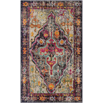 The captivating palette of grey and fuchsia, accentuated with pops of rich, jewel tones, brings a bold statement to your floor. The design features a dynamic, distressed pattern that adds depth and texture to your decor, creating an eye-catching focal point.