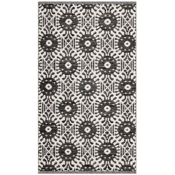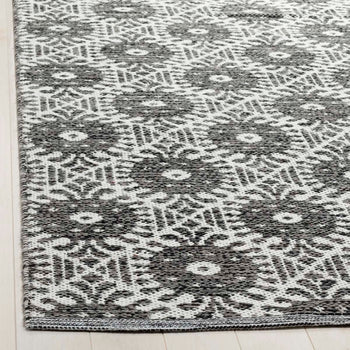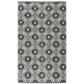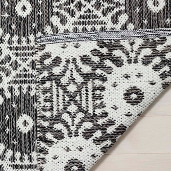 The striking pattern in bold black and ivory hues showcases a harmonious balance of traditional motifs that bring forth an aura of chic and worldly allure. Each detail on the rug speaks to a thoughtful composition that balances visual intensity with serene spaces, making it a captivating centerpiece or a complementary addition to a curated decor ensemble.